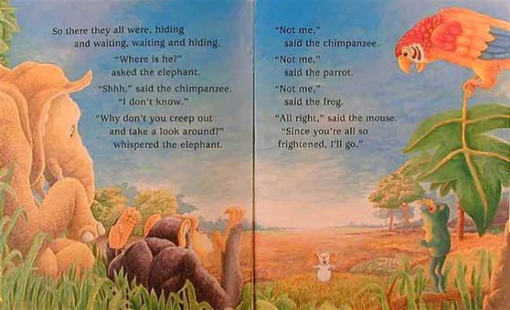 Word is out that rough, tough Big Bro is coming. The news spreads quickly through the jungle, sending all the animals into hiding. Finally, brave mouse volunteers to creep out and have a look, returning with the warning that he is indeed coming! When tiny mouse's older sibling appears, all the animals are humiliated. Nevertheless, the "Boo" that Big Bro roars manages to startle them all, and they concede to little mouse that he is indeed rough and tough. Large pages and big, bright illustrations in watercolor and ink make this humorous story a good read-aloud for storyhours.